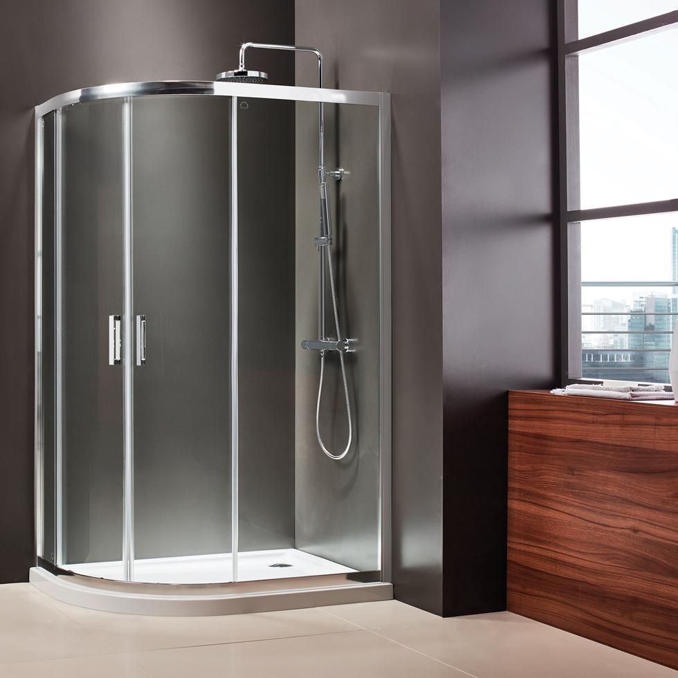 Καμπίνα ντουσιέρας ασύμμετρη 1/4 κύκλου με 2 σταθερά & 2 συρόμενα φύλλα (αντιστρεφόμενη) με μαγνητικό κλείσιμο