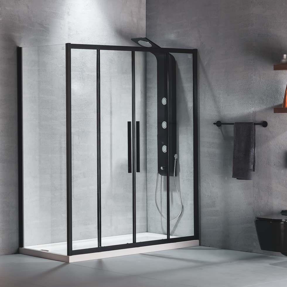 Πόρτα ντουσιέρας με 2 σταθερά & 2 συρόμενα φύλλα. Μπορεί να τοποθετηθεί είτε μόνη της, είτε με πλαϊνό σταθερό (side panel) 70, 80 ή 90 εκ.
