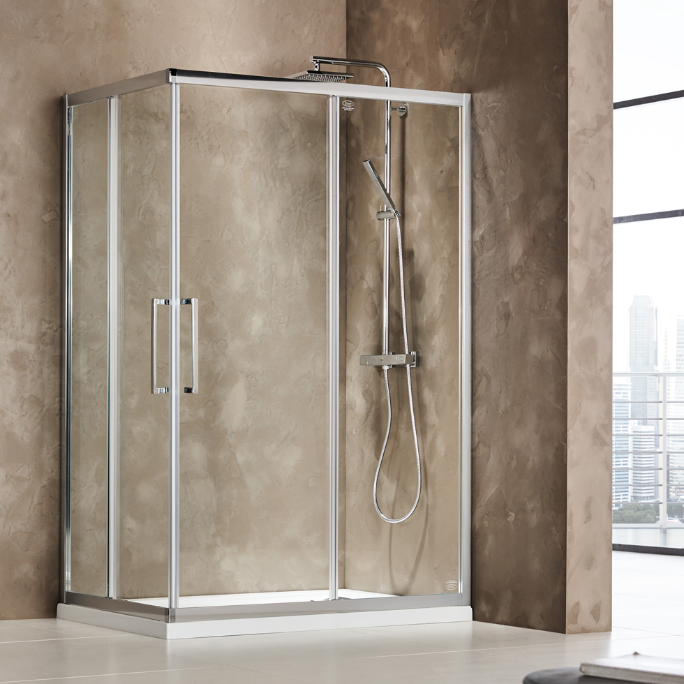 Καμπίνα γωνιακής εισόδου με 2 σταθερά & 2 συρόμενα φύλλα (αντιστρεφόμενα) με μαγνητικό κλείσιμο