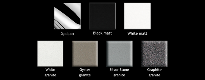 Στα φινιρίσματα χρώμιο & granite: περιστρεφόμενο ρουξούνι με συρόμενο ντους 2 λειτουργιών (shower / spray) | Στα φινιρίσματα black matt & white matt: περιστρεφόμενο ρουξούνι με συρόμενο ντους μονής λειτουργίας (shower).