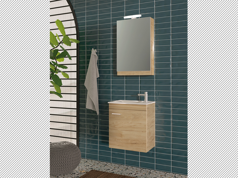 Η συγκεκριμένη σύνθεση της σειράς παράγεται σε 4 διατάσεις 50cm με νιπτήρα , σε μία απόχρωση λάκας σε λευκό γυαλιστερό και σε 4 αποχρώσεις μελαμίνης όψης ξύλου.